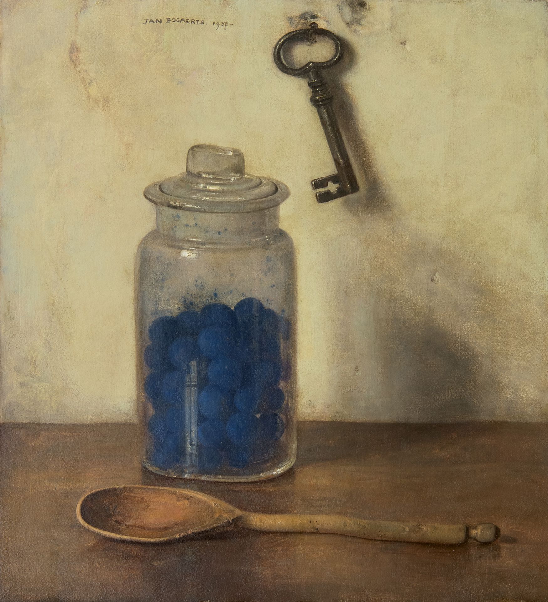 Glazen pot met blauwselbollen, olieverf op doek 36,0 x 32,9 cm, gesigneerd m.b. en gedateerd 1937